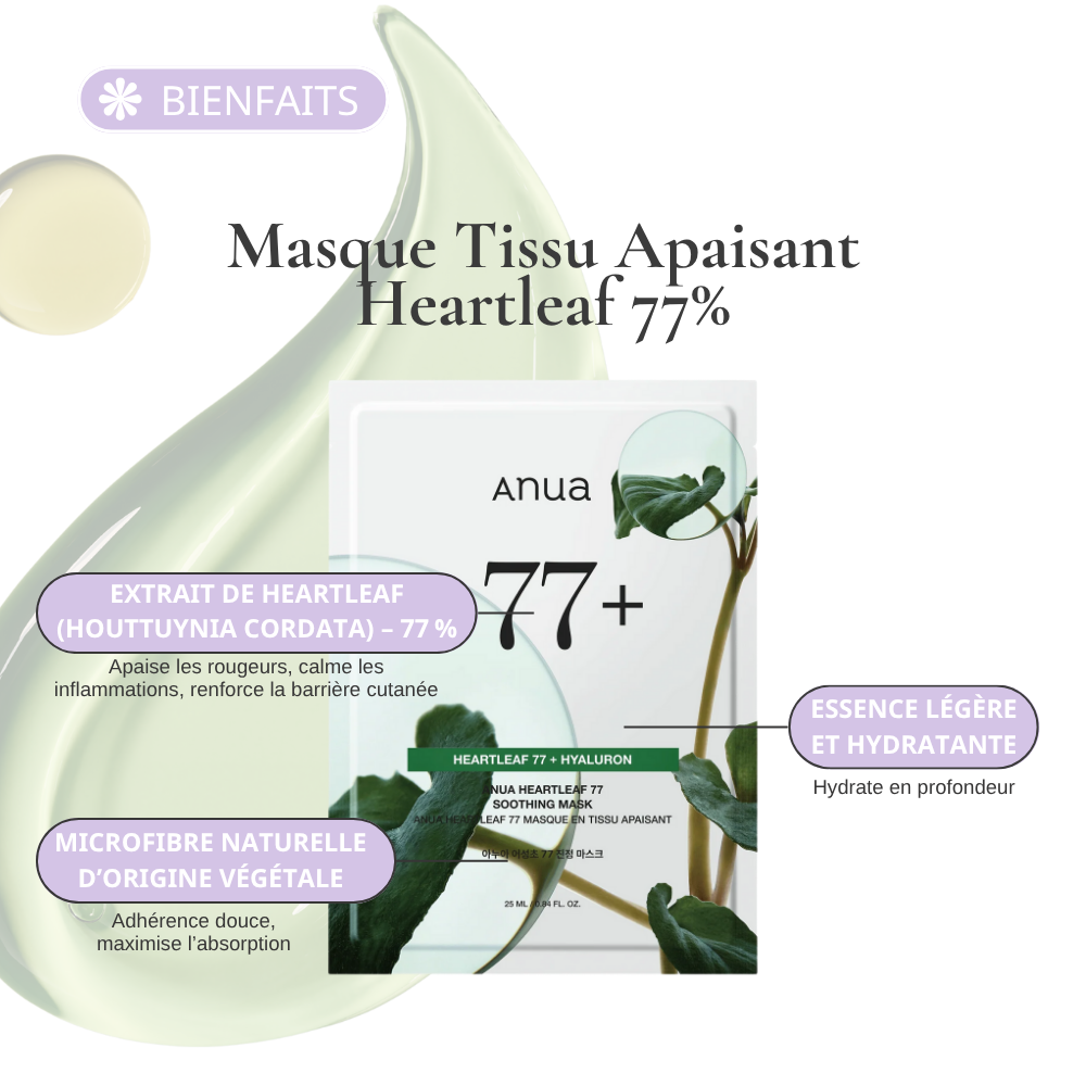 Masque tissu apaisant à 77 % de Heartleaf. Calme rougeurs et irritations, hydrate et protège les peaux sensibles. Confort immédiat.